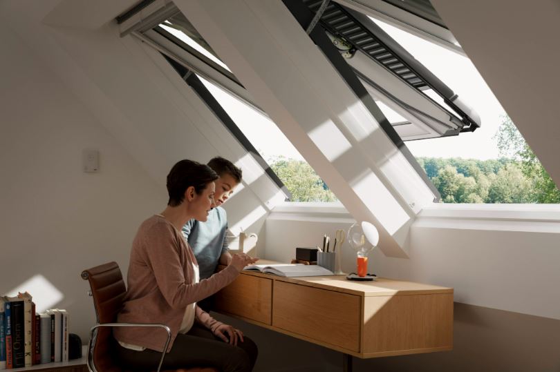 • Ventilația se poate realiza mult mai ușor și mai confortabil cu aplicația VELUX, compatibilă cu rulourile VELUX INTEGRA®, care permite deschiderea și închiderea lor cu o simplă apăsare de buton. Aceasta are și opțiunea de a lăsa sistemul să se bazeze pe senzorii conectați la clima interioară și este sincronizată cu prognoza meteo, pentru funcționare automată, fără a fi nevoie de a face pauză de la activitatea desfășurată pentru a gestiona lumina din încăpere.