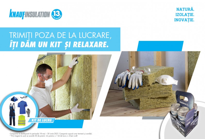 O bere rece din partea Knauf Insulation ca să te cinstești cu toată echipa și clientul la final de zi! În plus, primești un set complet de echipament de lucru doar pentru tine – până la urmă, tu ești cel care a avut prezența de spirit să se înscrie în campania promoțională “Trimiți poză de la lucrare, primești un kit și relaxare”, ce se desfăşoară în perioada 18 mai-30 iunie 2021. Așadar, meriți un bonus!