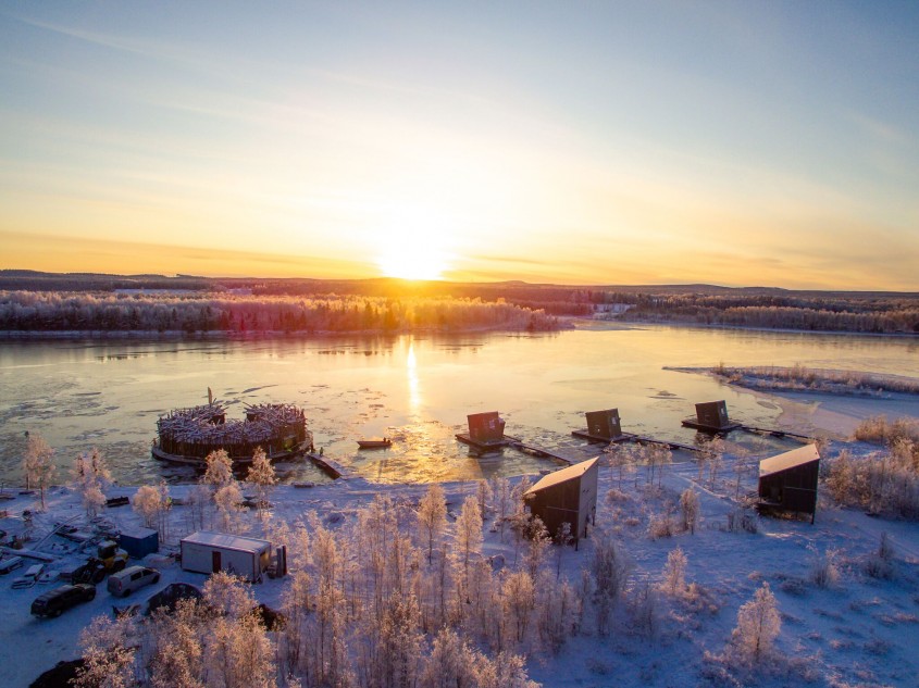 Arctic Bath este un hotel cu spa format dintr-o cladire principala plutitoare cu forma circulara si mai multe cabine amplasate atat pe apa, cat si pe mal.