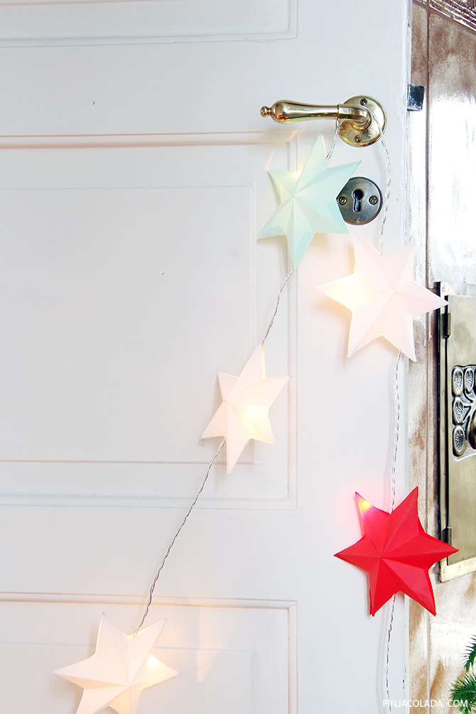 Iata o idee pentru o decoratiune handmade deosebita, fara a perturba insa vizual ideea de minimalism. Decupeaza stelute din hartie de diferite culori si acopera cu ele beculetele albe ale unei instalatii de Craciun. Vezi aici un tutorial interesant.