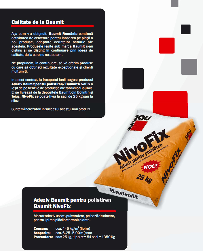 Punere in opera Adezivul NivoFix se va aplica pe placa termoizolanta pe margini sub forma de cordon perimetral cu o latime de 5 cm si in mijlocul placii 3 puncte de lipire. Pe suporturile netede adezivul NivoFix se poate aplica si pe intreaga suprafata a placilor utilizând spaclul cu dinti. Şpacluirea placilor se va face la minim 24 de ore de la lipire. Dupa 24 de ore de la lipire, placile termoizolante se dibluiesc. Adezivul NivoFix nu este recomandat ca masa de spaclu pentru armarea placilor de polistiren.
