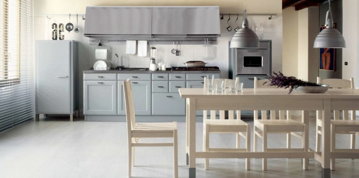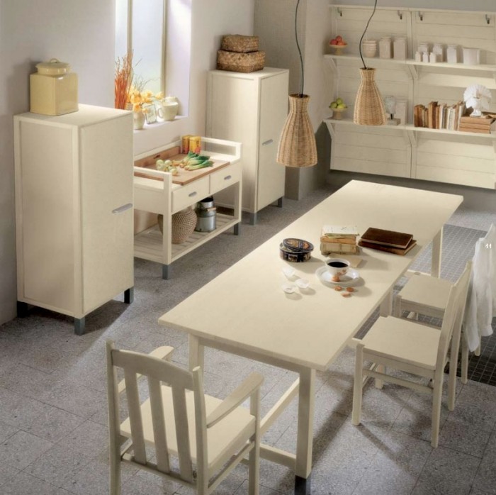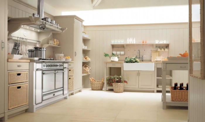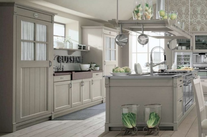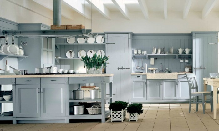 Desi felul in care sunt decorate bucatariile prezentate mai jos pronesc de la stilul rustic, ele au un anumit aer, original si modern. Secretul consta in accesoriile si mobilierul care aduce o doza de rafinament, mai potrivita pentru o locuinta dintr-o metropola (ba chiar o locuinta de lux), decat pentru o casuta la tara sau o fermă. Mobilierul este facut din lemn usor, finisat in culori delicate, placute (cularea mentei, a oului de rata... sau ceea ce noi orasenii am numi mai degraba albastru si verde pastelat, crem, galben). mai multe secrete ale acestui efect dublu al amenajarii (rustic si modern) pot fi descoperite dupa o studiere mai atenta a imaginilor urmatoare.