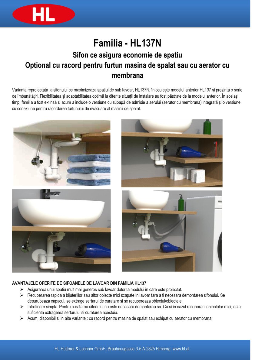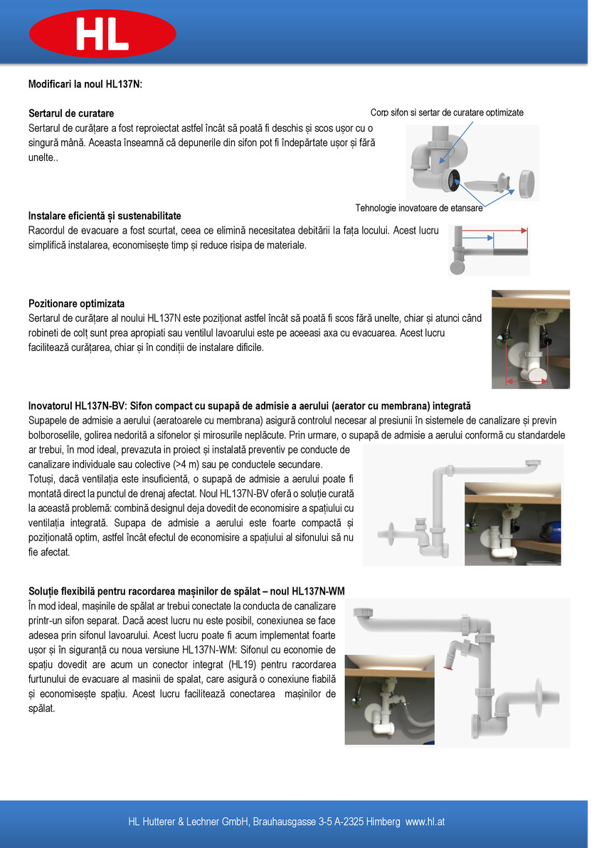 Noul sifon HL137N reprezintă evoluția modelului anterior, HL137, fiind reproiectat special pentru a maximiza spațiul util de sub lavoar. Acesta păstrează flexibilitatea și adaptabilitatea remarcabilă la instalare, dar vine cu o familie extinsă de produse. Acum, gama include versiuni specializate: cu supapă de admisie a aerului (aerator) integrată sau cu racord dedicat pentru evacuarea mașinii de spălat.