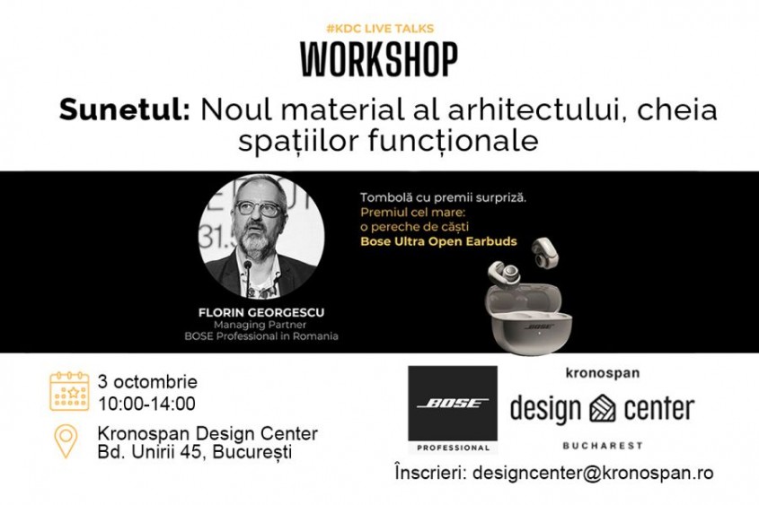 Toamna a început în forță pentru Bose Professional in Romania și continuă în același mod, datorită evenimentelor la care am avut plăcerea de a participa în luna septembrie, precum și a celor ce urmează. Cu această ocazie, lansăm invitația de a ne revedea sau de a ne cunoaște în data de 3 octombrie, începând cu orele 10:00, la Kronospan Design Center Bucharest, unde, în cadrul KDC Live Talks, vom susține workshopul intitulat „Sunetul: Noul material al arhitectului, cheia spațiilor funcționale”, urmat de o demonstrație cu Bose Auditioner și de o sesiune de Q&A.