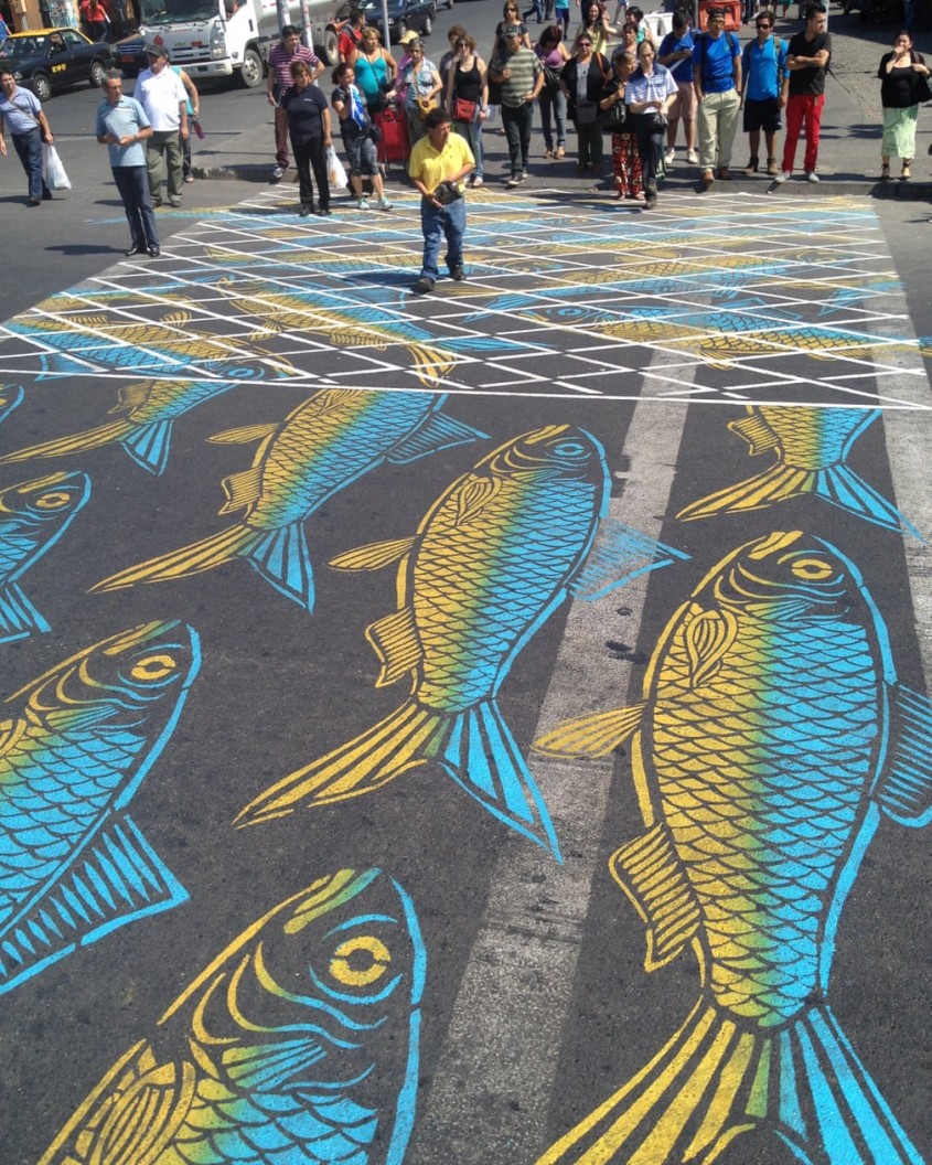Poza infatiseaza una dintre cele 13 treceri de pietoni care fac parte din instalatia numita Funnycross a artistului bulgar Christo Guelov, menita sa faca trecerile de pietoni din jurul scolilor madrilene mai sigure. Imaginate ca "un pod intre doua tarmuri", trecerile de pieton cu motive geometrice simple si culori saturate au rolul de a spori atentia soferilor si a pietonilor, impunand respect pentru aceasta forma de imbunatatire a sigurantei rutiere, explica artistul.