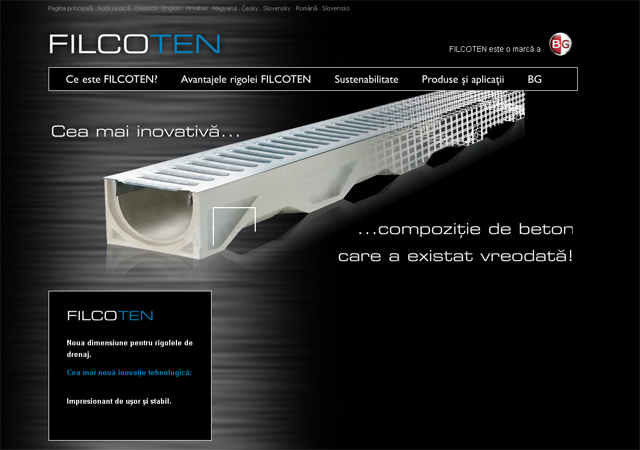 In 2010 a fost lansat site-ul www.filcoten.com, unde este prezentat un nou tip de rigola, rigola FILCOTEN. Un produs inovator care pune accent pe sustenabilitate si conservarea resurselor. O rigola fabricata printr-o tehnologie noua, din materiale de constructii minerale din care a rezultat un material compozit complet reciclabil. Gama de rigole FILCOTEN se dezvolta continuu, astfel ca aici va este oferita o prezentare generala a produselor. Pentru mai multe detalii va rugam accesati www.hydrobg.ro unde va punem la dispozitie cele mai actuale informatii despre aceasta gama de produse si aplicatiile lor. |