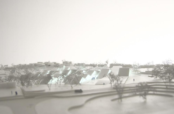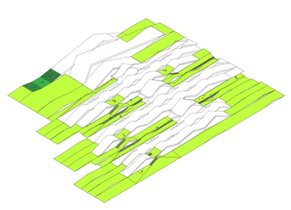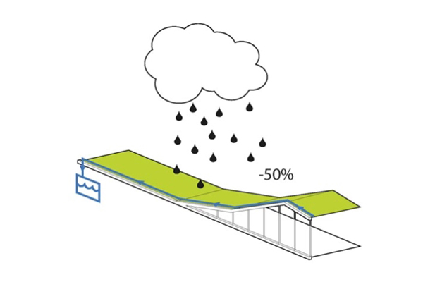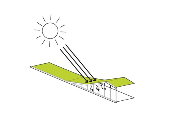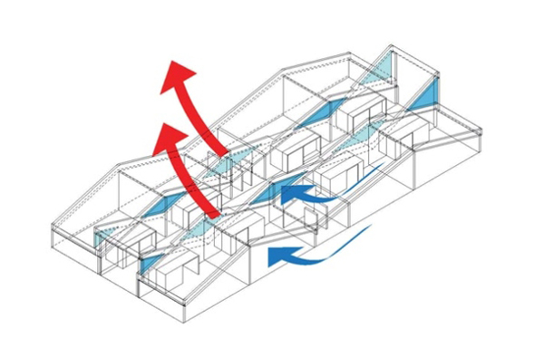 Acoperisurile in panta sunt decalate intre ele, astfel incat suprafetele vitrate de mari dimensiuni sa nu se umbreasca intre ele permitandu-se iluminarea naturala a spatiilor interioare. Trecerile dintre diferite sali se fac prin zonele de intersectie ale benzilor. Rezultatul este o serie de spatii in aceeasi masura intime si generoase. Racirea naturala se face cu ajutorul unui sistem de dizlocare care inlatura aerul statut din partea superioara a incaperilor si il inlocuieste cu aer proaspat, racit in mediul natural dintre volume.
