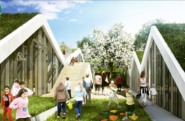 Am vazut din ce in ce mai multe acoperisuri verzi si aceasta preferinta este justificata de seria de beneficii pe care le au: controleaza debitul de apa in cazul ploilor abundente, termoizoleaza cladirile si aduc un plus de biodiversitate in cadrul oraselor. Prpunerea celor de la BIG duce aceasta abordare un pas mai departe pentru ca include acoperisul in suprafata folosita a unei scoli, oferindu-le copiilor un mediu diversificat pe care sa il exploreze. Intregul proiect combina optim structura realizata de om cu natura, asemeni unei explorari a ceea ce se poate invata de pe urma construirii cu mediul inconjurator.