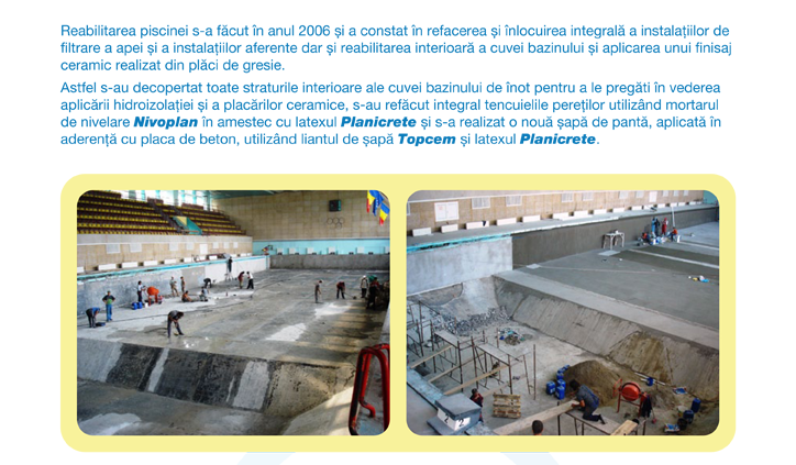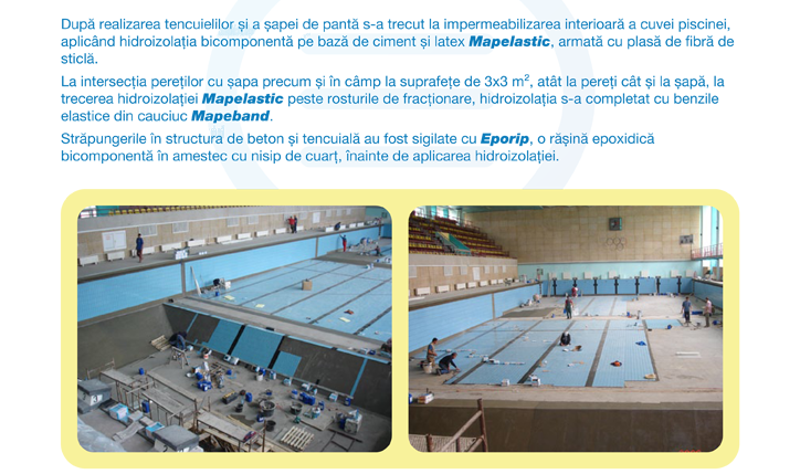 Mapegum WPShttp://www.spatiulconstruit.ro/documentatie-tehnica/ghid-proiectare-impermeabilizari-solutii-mapei-object_id=54756Evenimente, prezentări, seminariiCuprins- Produsul lunii- Materiale de informare noi- Evenimente, prezentări, seminarii- Proiect de referință - Soluții tehniceContinuăm campania de informare asupra activităii Grupului Mapei, prin lansarea newsletter-ului cu numărul 7, pe care vă invităm să îl parcurgei în cele ce urmează.Proiect de referință - Soluții tehniceMateriale de informare noiProdusul luniihttp://www.mapei.roNEWSletterhttp://www.mapei.com/public/COM/products/2904_ecoprimpu1k_gb.pdfhttp://www.mapei.com/public/COM/products/279_ultrabondp9901k_gb.pdfhttp://www.mapei.com/public/RO/products/555-Cleaner-L_RO.pdfnr. 07Noiembrie 20131937•1946 1957•1966 1967•19761987•20121977•1986Material de impermeabilizare a spaiilor umede (băi, cabine de duș), cu aplicare la rece.Ce este Mapegum WPS?• Este o hidroizolație lichidă pe bază de rășini sintetice în dispersie apoasă, fără solvenți, utilizată pentru impermeabilizarea și protecia materialelor de construcie, care au o rezistenă limitată la umiditate și care se vor utiliza în spaii umede (băi, dușuri, bucătării etc.). Materialul se prezintă sub forma unei paste, semifluidă, asemănătoare unei vopsele lavabile. • După aplicarea pe suport în strat uniform, în grosime finală de minim 1 mm și prin evaporarea apei din coninut, materialul suferă o reacie chimică ireversibilă, transformându-se într-un strat hidroizolant, impermeabil și elastic.Unde se aplică Mapegum WPS?• Pe pereți din gips carton, tencuieli de ipsos, tencuieli de ciment finisate cu gleturi pe bază de ipsos, șape de ipsos, plăci PAL, plăci OSB;• Se utilizează numai pentru spații interioare, în zone sau pe suprafețe fără imersie continuă în apă, pe suprafee pe care apa poate veni în contact direct cu placarea, fie accidental, fie că se prelinge datorită jetului de la duș, iar stratul suport al placărilor ceramice este constituit din materiale care sunt sensibile sau au o rezistenă limitată la umiditate. Exemple: bucătării, băi, dușuri, grupuri sanitare, spații cu umiditate ridicată după darea în folosință, dar fără contactul permanent cu apa (bazine de apă, jacuzzi, piscine). AVANTAJELE utilizării hidroizolaiei de interior Mapegum WPS (SR EN 14891)În cadrul lucrărilor de hidroizolare se pot folosi o multitudine de materiale: soluii bituminoase cu aplicare prin pensulare, mase de șpaclu din rășini poliuretanice, soluii epoxidice bicomponente. Din punct de vedere al ușurinei în aplicare și a timpului scurt de lucru, se detașează hidroizolaia monocomponentă în dispersie apoasă Mapegum WPS. În plus, este important de subliniat ca după uscare, suprafaa hidroizolată se pretează a fi placată direct cu finisaj ceramic (mozaic, faiană, gresie, piatră naturală), iar lipirea se face cu adezivi îmbunătăii pe bază de ciment de tip C2 (ex: Kerabond T-R cu latex Isolastic, Adesilex P9, Keraflex Maxi S1) Ambalare: gălei de 5, 10 și 25 kg. Consum: 1,5 kg / m² / mm de grosimeDetalii suplimentare găsii în fișa tehnică sau accesând link-ul.Reabilitarea piscinei s-a făcut în anul 2006 și a constat în refacerea și înlocuirea integrală a instalaiilor de filtrare a apei și a instalaiilor aferente dar și reabilitarea interioară a cuvei bazinului și aplicarea unui finisaj ceramic realizat din plăci de gresie.Astfel s-au decopertat toate straturile interioare ale cuvei bazinului de înot pentru a le pregăti în vederea aplicării hidroizolaiei și a placărilor ceramice, s-au refăcut integral tencuielile pereilor utilizând mortarul de nivelare Nivoplan în amestec cu latexul Planicrete și s-a realizat o nouă șapă de pantă, aplicată în aderenă cu placa de beton, utilizând liantul de șapă Topcem și latexul Planicrete.SC MAPEI ROMÂNIA SRL Str. Gen. Ion Dragalina nr. 14, Sector 5, BucureștiTelefon: +4021 311 78 19 / 021 311 78 20 – Fax: +4021 311 78 21www.mapei.rohttp://www.spatiulconstruit.ro/?l1=detalii&l2=newsletter&object_id=4917Reabilitarea Piscinei Olimpice – Universitatea Tehnică, Cluj Napocahttp://www.mapei.com/public/COM/products/279_ultrabondp9901k_gb.pdfADESIVI • SIGILLANTI • PRODOTTI CHIMICI PER L’EDILIZIAPentru categoria produselor de impermeabilizare v-am pregătit două noi materiale de informare ce cuprind informaii complete atât din cadrul lucrărilor noi de construcii, cât și pentru cele care necesită renovare. Ghid de alegere a produselor pentru impermeabilizări:• Impermeabilizarea fundațiilor situate sub nivelul solului în cadrul construcțiilor noi• Renovarea structurilor subterane supuse infiltrațiilor de apă sub presiune• Materiale pentru hidroizolarea băilor, piscinelor, balcoanelor și teraselor• Materiale pentru hidroizolarea structurilor subteraneGhidul prezintă în detaliu atât soluiile tehnice potrivite fiecărei situaii în parte, cât și materialele necesare.Pentru a vizualiza documentul în format electronic, accesai următorul link.http://www.spatiulconstruit.ro/documentatie-tehnica/ghid-selectie-produse-pentru-impermeabilizari-mapei-object_id=54757Ghid de proiectare impermeabilizăriUn material cu adevărat de ajutor, ce oferă suport proiectanilor și arhitecilor în stabilirea cât mai corectă a specificaiilor tehnice și a detaliilor de proiectare și reducerea erorilor de aplicare. Ghidul este împărit în două seciuni: prima prezintă detaliile de construcie la impermeabilizarea noilor construcii, iar cea de-a doua acoperă zona de reamenăjări și reparaii.Pentru a vizualiza documentul în format electronic, accesai următorul link.perete gips cartonbandă de etanșare din PVCMapeband PE120Exemplu de aplicareetanșant siliconicMapesil ACchit de rosturiUltracolor Plusplăci ceramiceadeziv îmbunătăit pe bază de cimentAdesilex P9membrană hidroizolantă