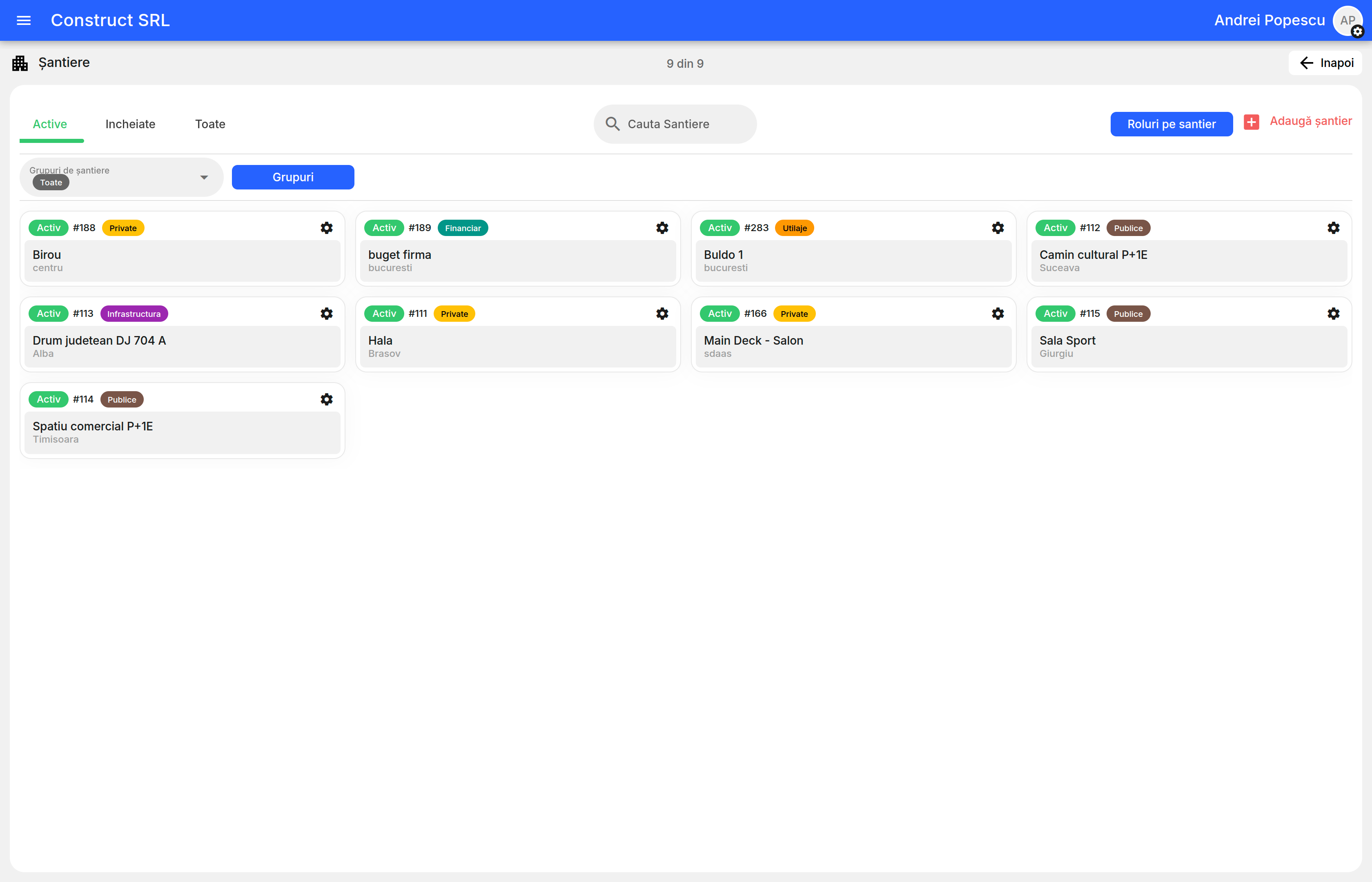 • Pontaj și prezență: evidența echipelor pe șantier, ore lucrate, pe fiecare șantier in parte.