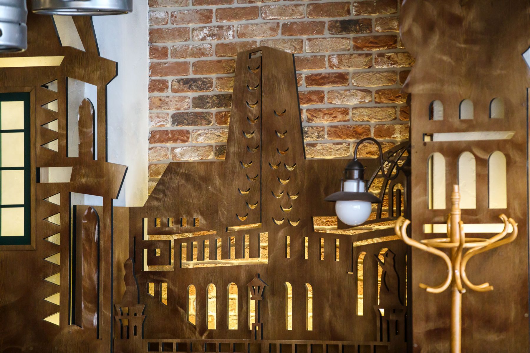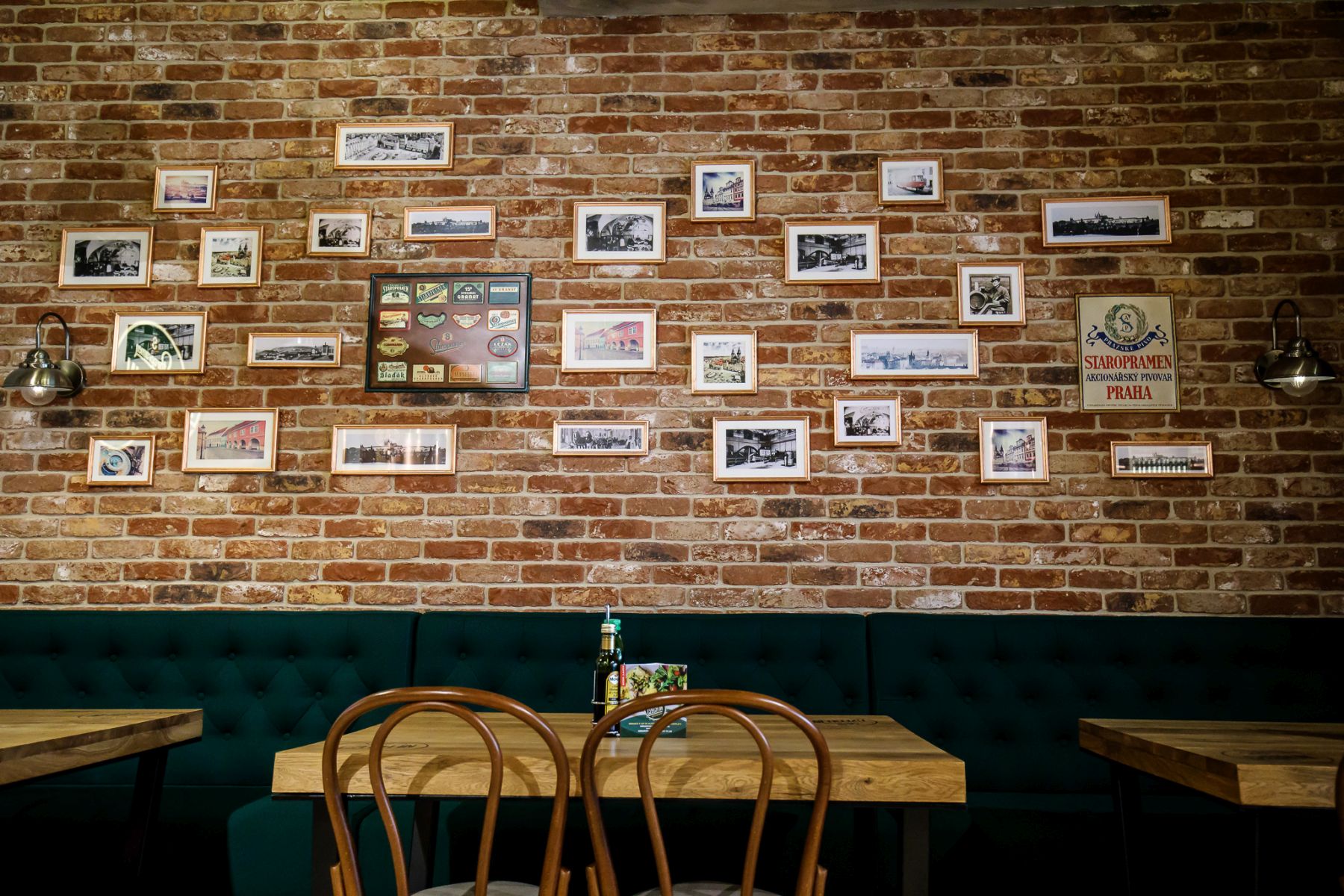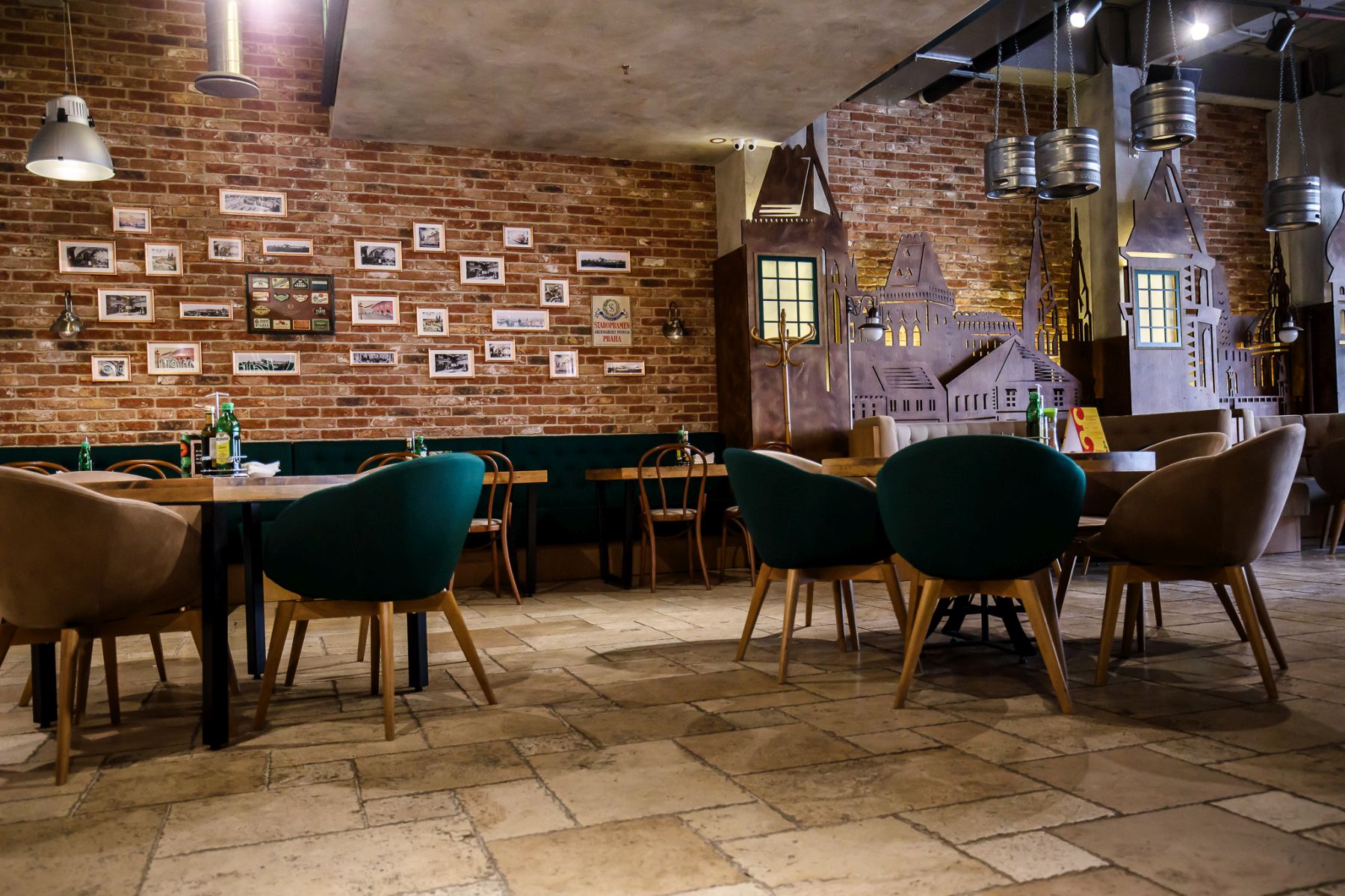 Pereții din cărămidă aparentă creează o atmosferă caldă, relaxantă, care invită la socializare și la savurarea preparatelor specifice. Designul interior este completat de mobilier din lemn, accente metalice și elemente decorative inspirate din cultura cehă, iar cărămida te duce cu gandul la cladirile vechi in capitala Cehiei. Clienții se bucură de un spațiu autentic, cu personalitate, unde fiecare detaliu vizual contribuie la experiența generală.