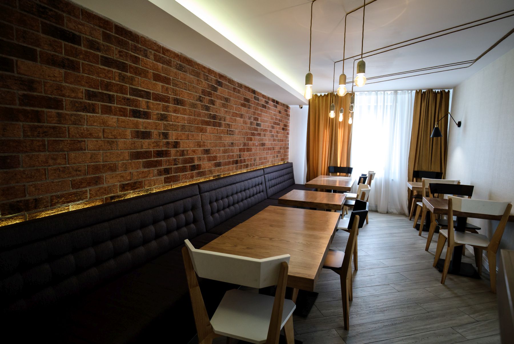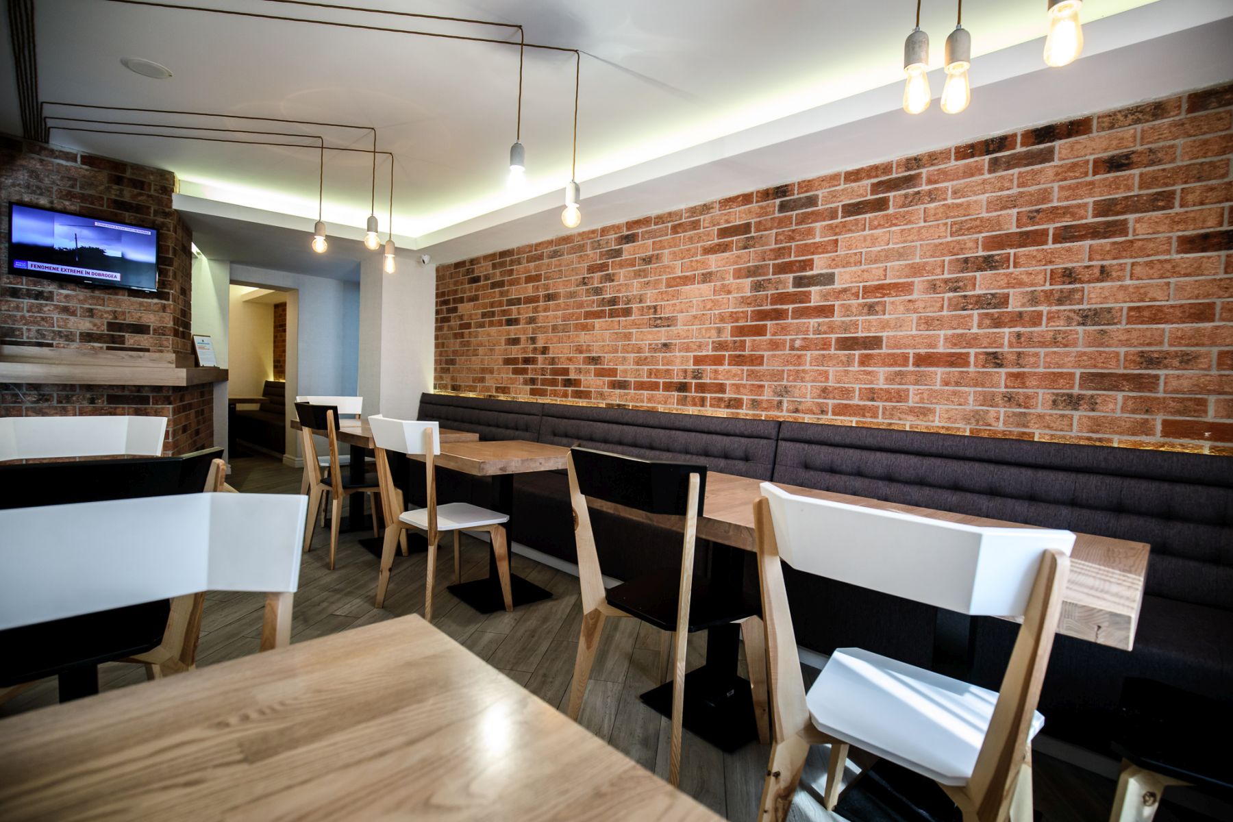Montajul a fost realizat cu atenție la detalii, fiecare bucată de cărămidă fiind poziționată pentru a crea un efect natural, fără rigiditate, dar cu multă personalitate. Cărămida aparentă a fost integrată atât pe pereții recepției, cât și în zona de bar, unde reflectă lumina într-un mod subtil și creează un fundal cald pentru socializare, relaxare sau întâlniri de afaceri.